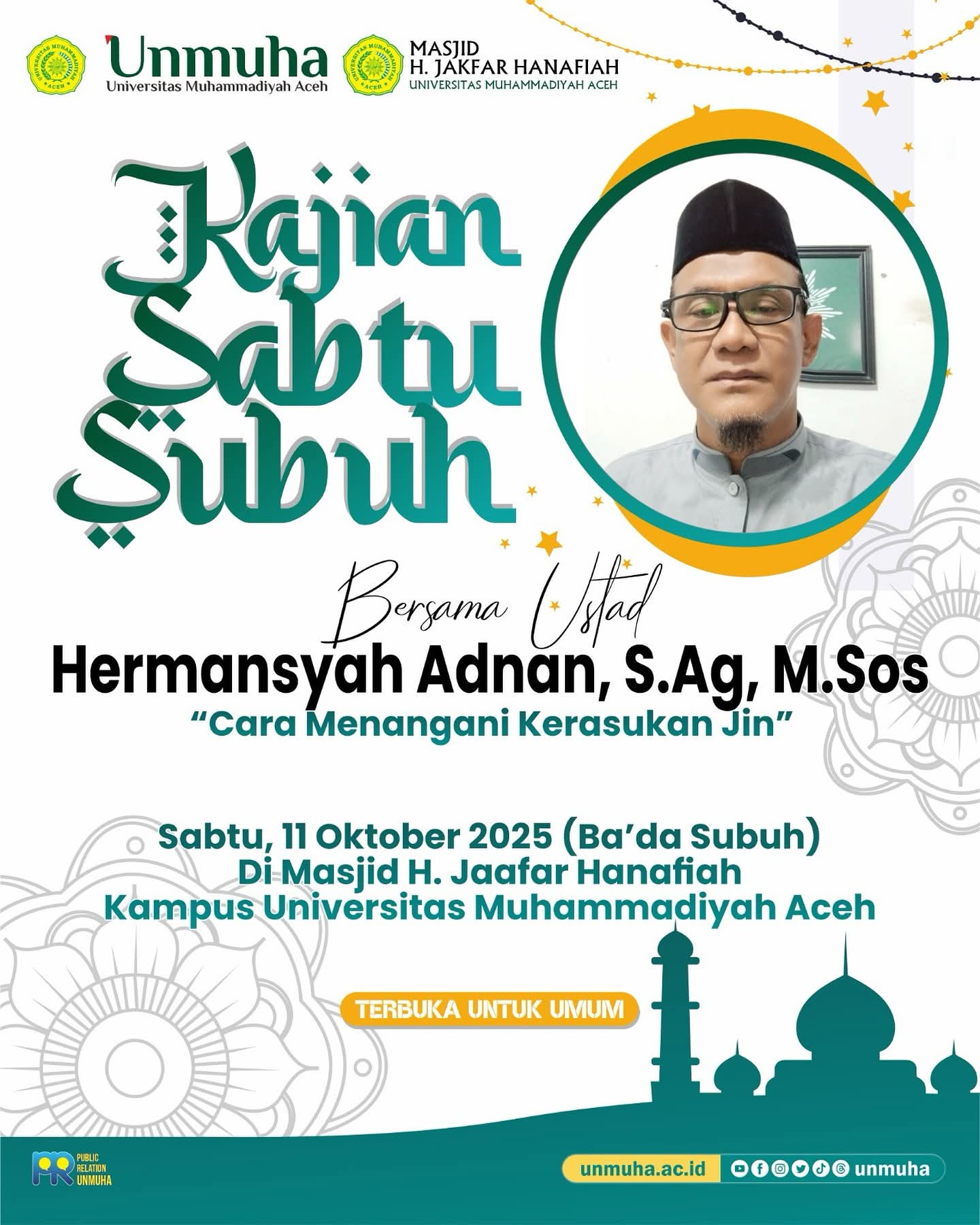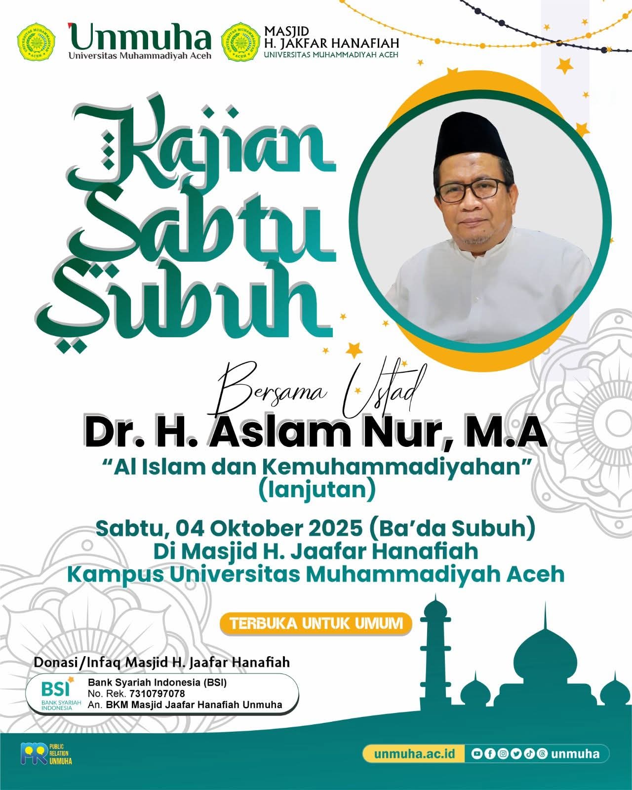 Pengajian Rutin Sabtu Subuh 25 Oktober 2025 Masjid Tgk. H. Jaafar Hanafiah Universitas Muhammadiyah Aceh ============================== Ust. H. Surianto Sudirman, LC, MA ============================== Pada kesempatan kali ini, kita akan mengkaji…